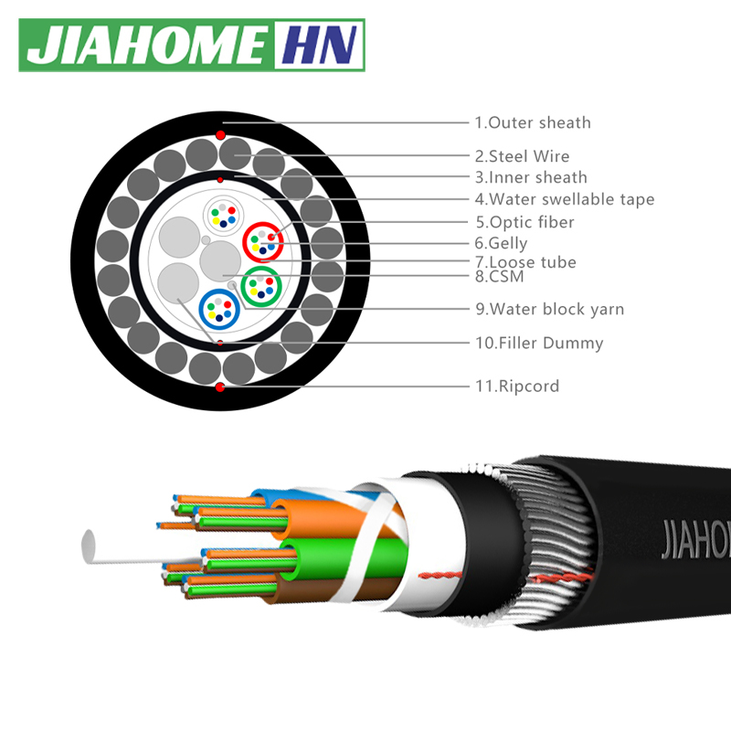 Glasfaserkabel für den Außenbereich für die Kommunikation mit Metallverstärkungselementen, Bündeladerschicht mit verdrillter Füllung, Aluminium-Polyethylen-Verbundmantel, einschichtiger, dünner runder Stahldraht mit gepanzertem Polyethylen-Außenmantel.